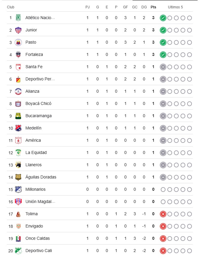 La tabla de posiciones tras la primera fecha refleja un triple empate en la cima con Nacional, Junior y Pasto, todos con tres unidades, seguidos por Fortaleza. En la parte baja, Cali y Once Caldas comparten el fondo con 0 puntos y -2 de diferencia.
